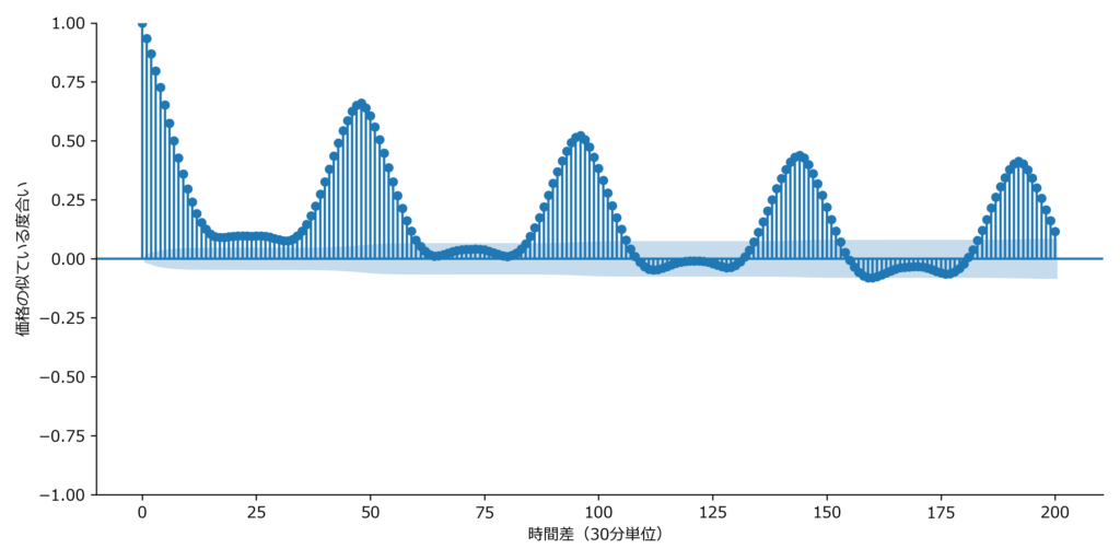 このような市場では、昨日の同時刻の価格が今日の価格に影響する傾向が強く、概念的にはAR(48)型の構造として理解することもできます。