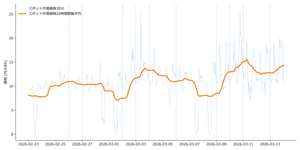 3月上旬から、東京エリアのスポット価格の24時間移動平均が明確に切り上がり始めているためです。