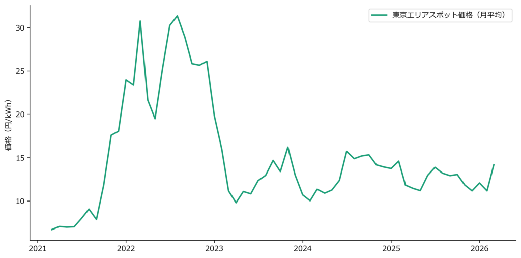 足元の東京エリアの卸電力市場価格は、従来の水準から一段高い価格帯へ移行しています。