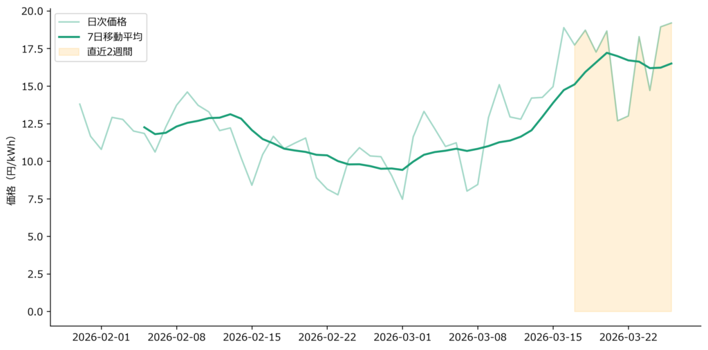 JEPXスポット価格は2026年3月以降、明確に上昇基調へ転じており、特に3月中旬以降は新しく切り替わった水準が継続しています。