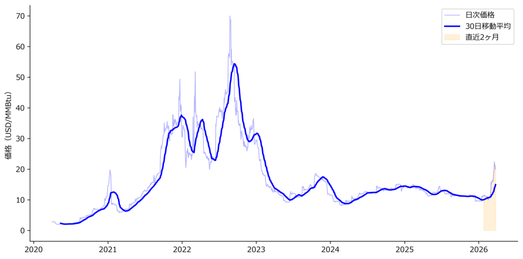 LNG価格は2024年以降、比較的安定したレンジで推移していましたが、足元では上昇方向への変化が見られます。