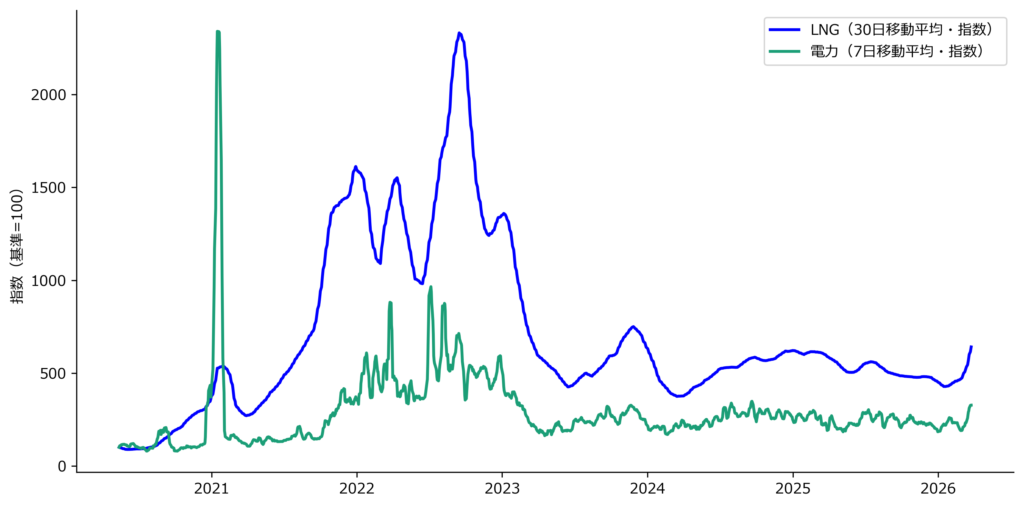 さらに、電力価格とLNG価格を指数化して比較すると、両者の動きは再び連動していることが確認できます。
