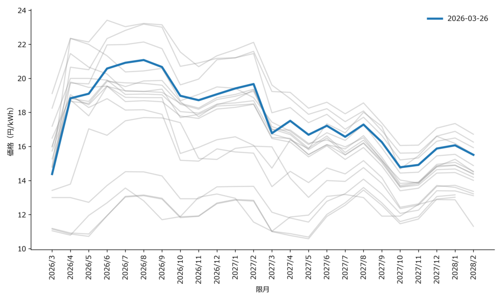 電力先物のフォワードカーブを見ると、2026年度は現在のスポット価格よりも更に高い水準で形成されています。