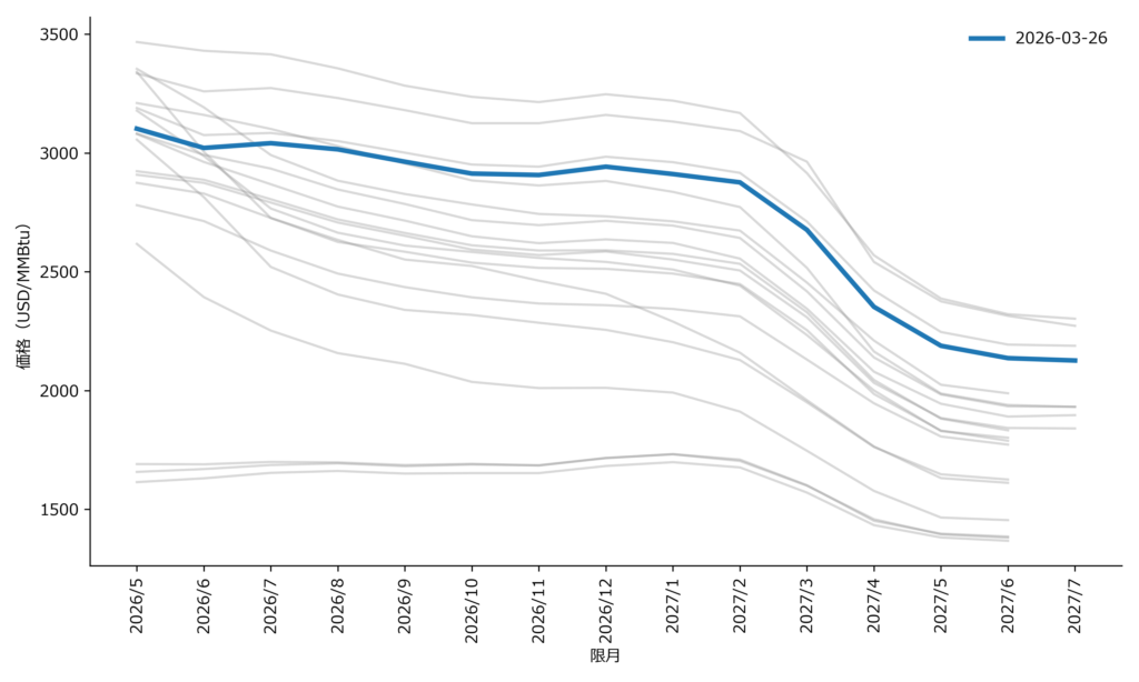 また、LNG先物も同様に、短期より高めの価格水準を示しています。