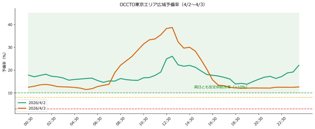 4月2日、3日の東京エリアにおける広域予備率を見ると、