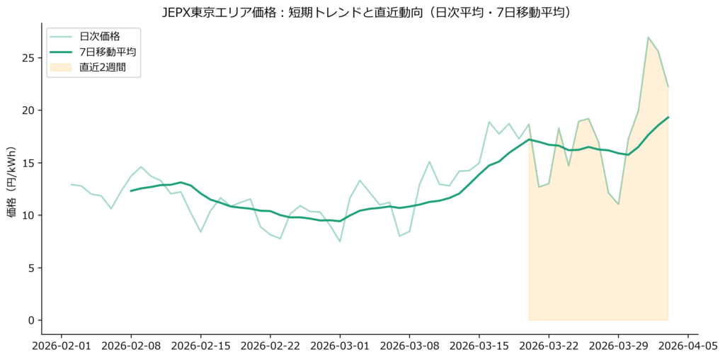 東京エリアのスポット市場価格は、2月以降、日次では変動しつつも、7日移動平均では明確な上昇トレンドを示しています。