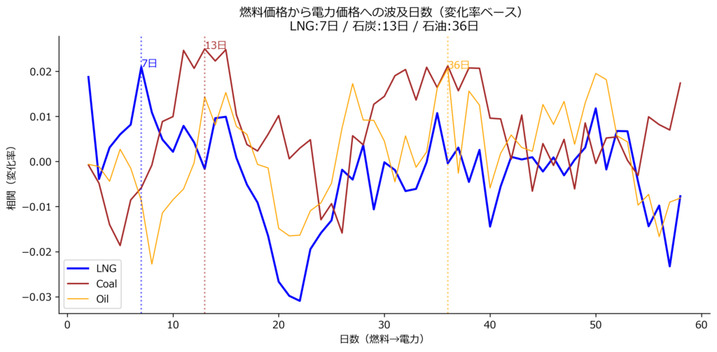 過去データの分析から、燃料価格の変化は電力市場価格に即座に反映されるのではなく、一定の時間差を伴って現れることが確認されます。