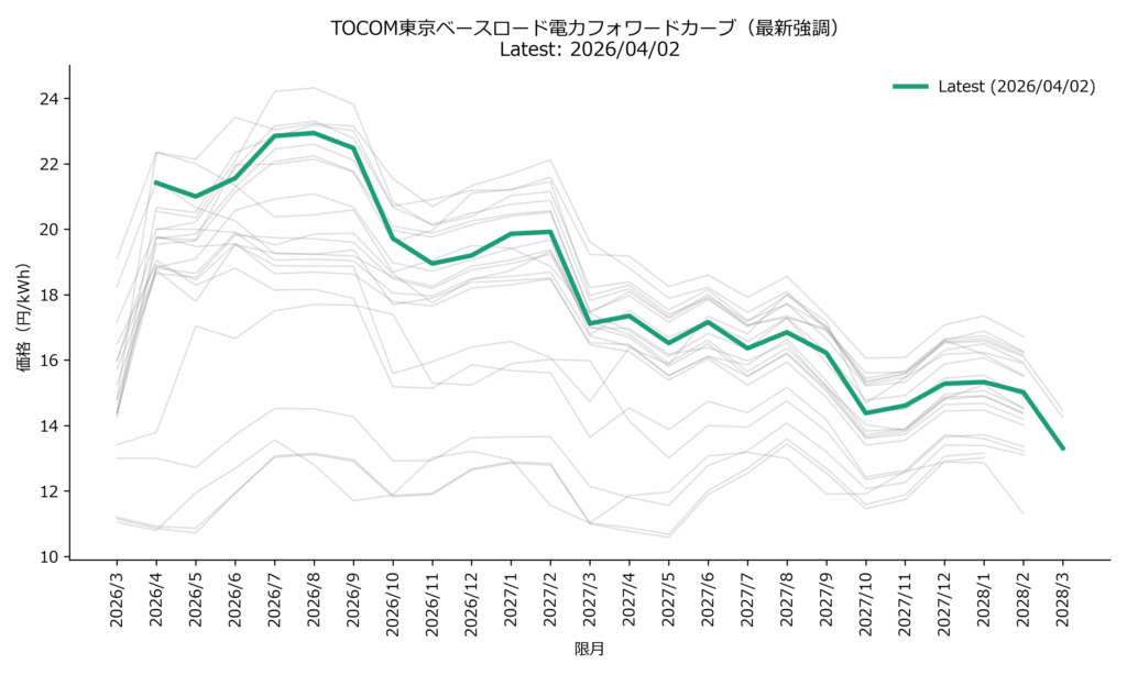 重要なのは、フォワードカーブ全体が上方シフトしている点であり、市場が現在の価格水準を一時的ではなく、一定程度持続するものとして織り込んでいることが示唆されます。