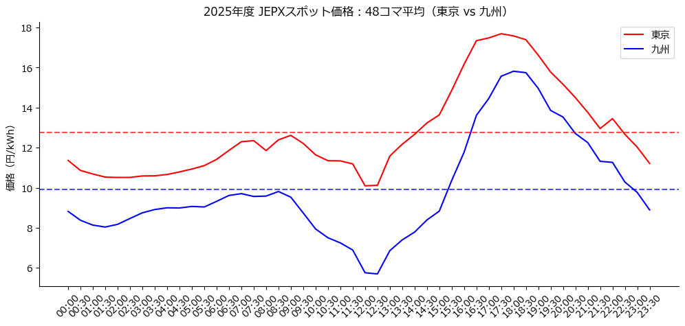 下図は、東京と九州における30分単位の価格推移(折れ線)と、その平均水準(点線)を示したものです。