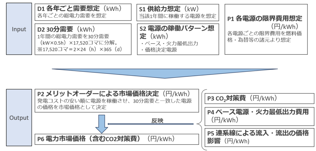 といった要素を統合的に扱い、需給バランスに応じて限界費用が決定される構造を再現することで、市場価格を内生的に決定します。